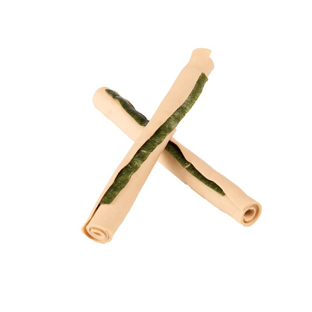 Premio masticable dentales en forma de palito, hecho a base de vegetales y pollo.
