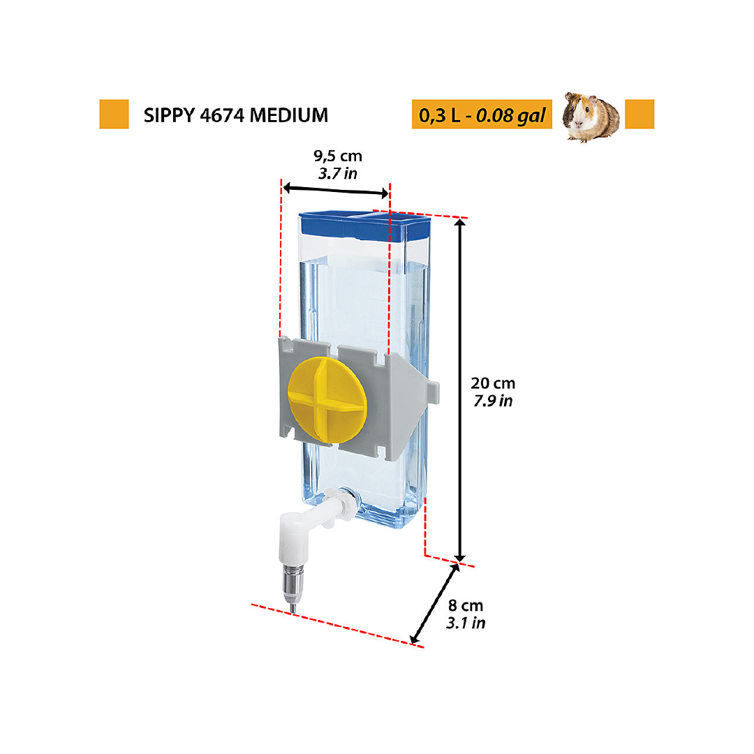 Sippy Medium es una botella de bebida para animales pequeños que puede fijarse en jaulas de alambre y plásticas gracias a las ventosas con las que cuentan.