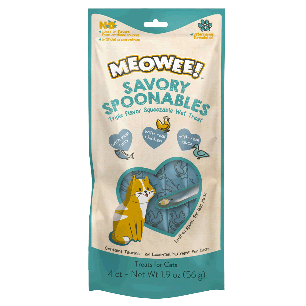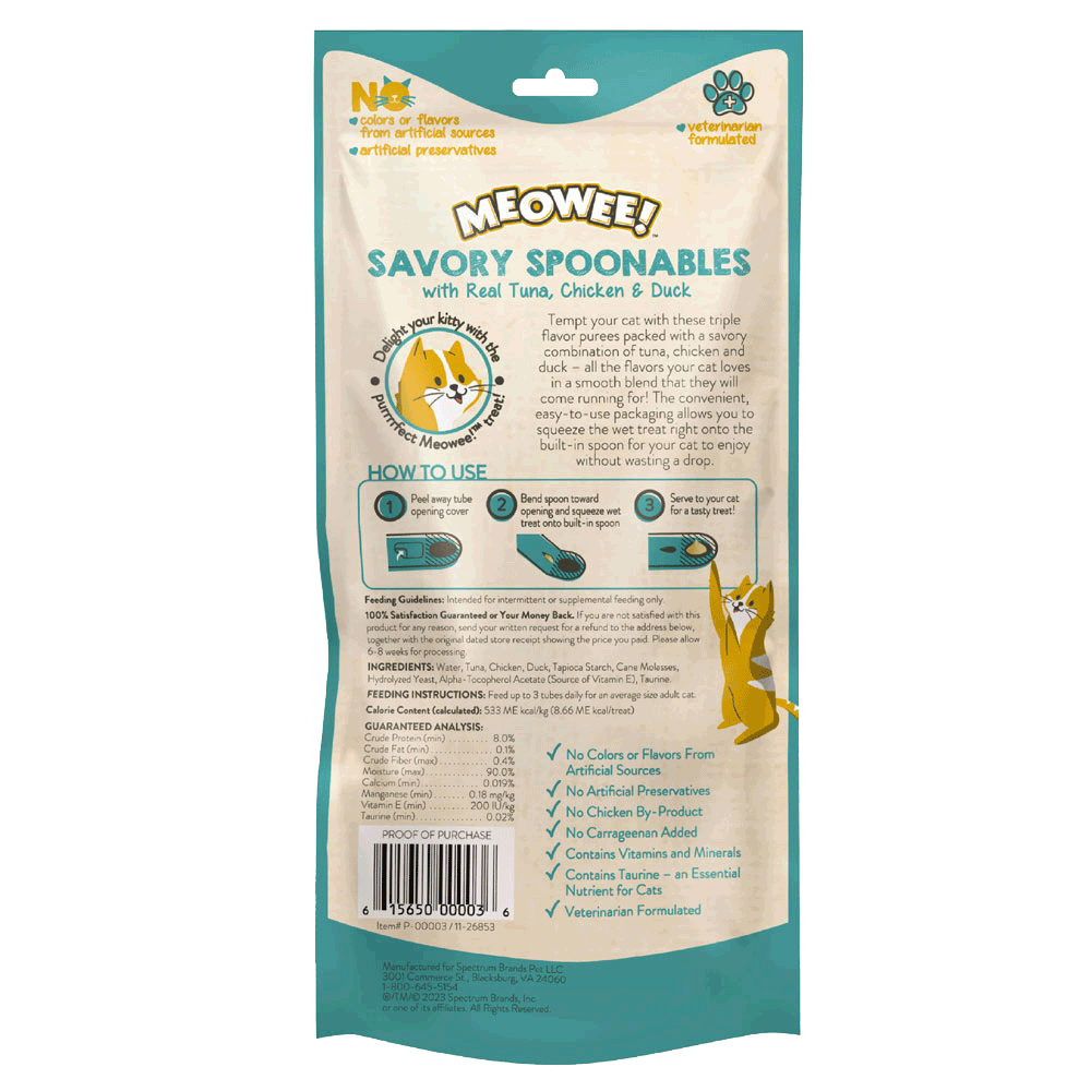 MEOWEE!™ te invita a fortalecer el vínculo con tu felino favorito a través de este innovador y delicioso snack. Los Savory Spoonables cuentan con una práctico diseño de envase que integra una cuchara, lo que permite que tu gato disfrute un delicioso snack hasta la última gota, de manera más cómoda y segura. Consiente a tu gato con esta combinación irresistible de atún, pollo y pato, mezclados en un cremoso y suave puré.