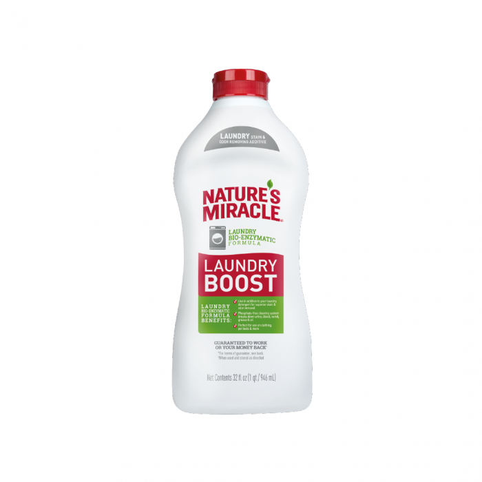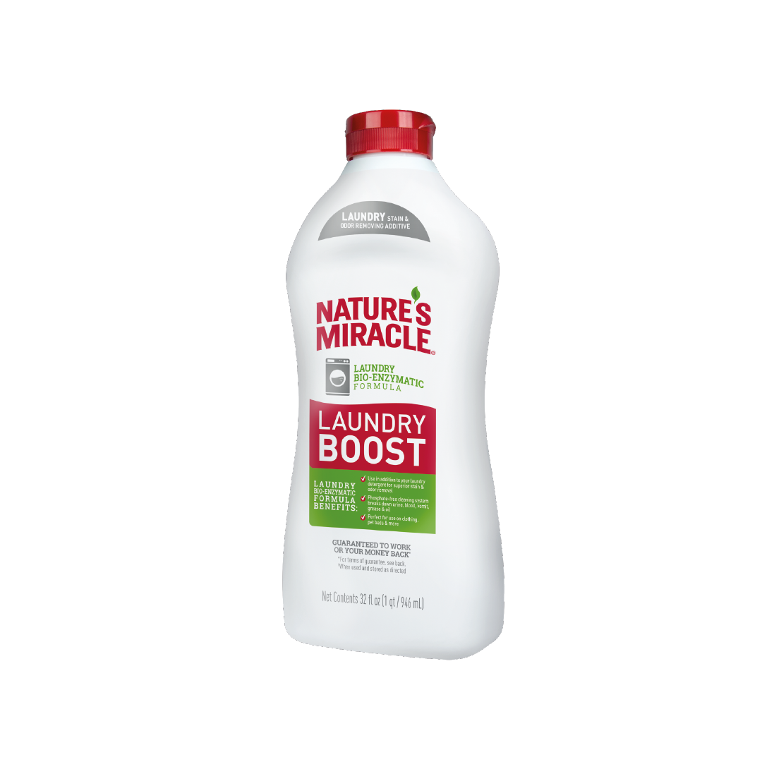 Nature’s Miracle® Laundry Boost está especialmente formulado con potentes agentes limpiadores de manchas y olores que penetran, aflojan y eliminan las manchas y los olores más difíciles de las mascotas.